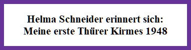 Die erste Kirmes in Thür fand nach der Währungsreform im Jahr 1948 auf dem Kaiserplatz statt. Ein Kinderkarussell, eine Schiffschaukel, ein Kettenkarussell und ein paar Buden brachten unsere Kinderaugen (ich war damals 12 Jahre alt) zum Leuchten. Was eine Fahrt auf dem Kinderkarussell damals kostete, weiß ich nicht mehr genau, wir Kinder bekamen 20 Pfennige und die reichten aus, um eine Attraktionen einmal auszuprobieren.