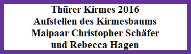 Nachdem der 20-jährige Christopher Schäfer vom Thürer Junggesellenverein in der Walpurgisnacht am Vorabend des 01. Mai die gleichaltrige Jura-Studentin Rebecca Hagen als seine Maikönigin ersteigert hatte, nahm das Maikönigspaar selbstverständlich am Freitagabend, 06.05. 2016 auch an der großen Schaumparty in der Dorfscheune teil und war sowohl bei der Eröffnung des Bierbrunnens als auch beim Aufstellen des Mai- und Kirmesbaumes durch die Thürer Junggesellen am späten Samstagnachmittag (07.05.2016) vor Ort.
